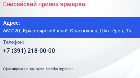 Енисейский привоз, ярмарка по адресу 660020, Красноярский край, Красноярск, Шахтёров, 35 в дальнейшем Организация, размещена в следующих категориях: