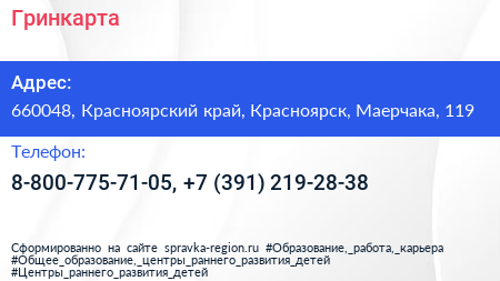 Гринкарта по адресу 660048, Красноярский край, Красноярск, Маерчака, 119 в дальнейшем Организация, размещена в следующих категориях: