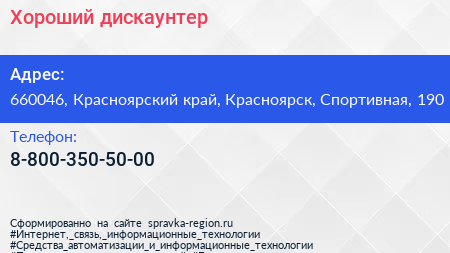 Хороший, дискаунтер по адресу 660046, Красноярский край, Красноярск, Спортивная, 190 в дальнейшем Организация, размещена в следующих категориях: