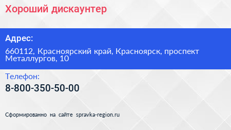 Хороший, дискаунтер по адресу 660112, Красноярский край, Красноярск, проспект Металлургов, 10 в дальнейшем Организация, размещена в следующих категориях: