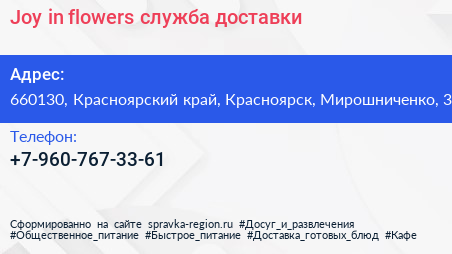 Joy in flowers, служба доставки по адресу 660130, Красноярский край, Красноярск, Мирошниченко, 3 в дальнейшем Организация, размещена в следующих категориях: