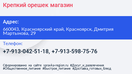 Крепкий орешек, магазин по адресу 660043, Красноярский край, Красноярск, Дмитрия Мартынова, 29 в дальнейшем Организация, размещена в следующих категориях: