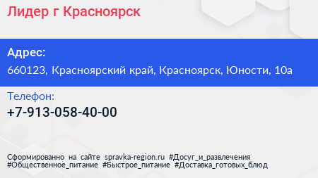 Лидер, г. Красноярск по адресу 660123, Красноярский край, Красноярск, Юности, 10а в дальнейшем Организация, размещена в следующих категориях: