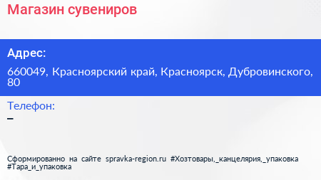 Магазин сувениров по адресу 660049, Красноярский край, Красноярск, Дубровинского, 80 в дальнейшем Организация, размещена в следующих категориях: