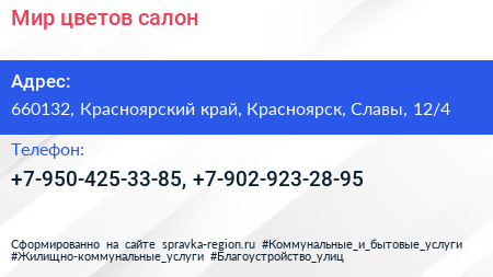 Мир цветов, салон по адресу 660132, Красноярский край, Красноярск, Славы, 12/4 в дальнейшем Организация, размещена в следующих категориях: