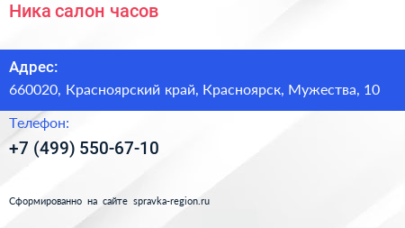 Ника, салон часов по адресу 660020, Красноярский край, Красноярск, Мужества, 10 в дальнейшем Организация, размещена в следующих категориях: