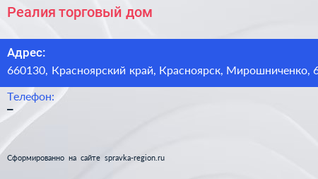 Реалия, торговый дом по адресу 660130, Красноярский край, Красноярск, Мирошниченко, 6 в дальнейшем Организация, размещена в следующих категориях: