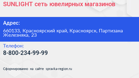 SUNLIGHT, сеть ювелирных магазинов по адресу 660133, Красноярский край, Красноярск, Партизана Железняка, 23 в дальнейшем Организация, размещена в следующих категориях: