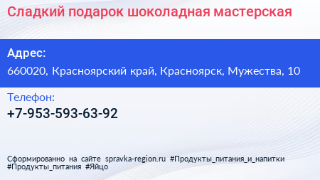 Сладкий подарок, шоколадная мастерская по адресу 660020, Красноярский край, Красноярск, Мужества, 10 в дальнейшем Организация, размещена в следующих категориях: