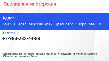 Ювелирная мастерская по адресу 660131, Красноярский край, Красноярск, Воронова, 18 в дальнейшем Организация, размещена в следующих категориях: