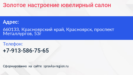 Золотое настроение, ювелирный салон по адресу 660133, Красноярский край, Красноярск, проспект Металлургов, 53г в дальнейшем Организация, размещена в следующих категориях: