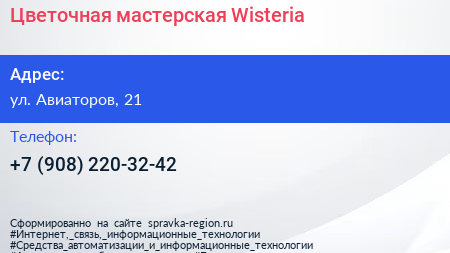 Цветочная мастерская Wisteria по адресу ул. Авиаторов, 21 в дальнейшем Организация, размещена в следующих категориях: