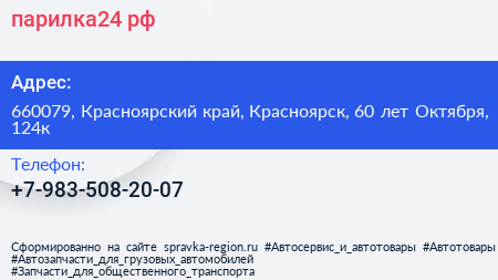 парилка24.рф по адресу 660079, Красноярский край, Красноярск, 60 лет Октября, 124к в дальнейшем Организация, размещена в следующих категориях: