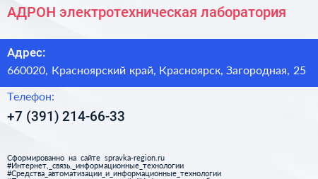 АДРОН, электротехническая лаборатория по адресу 660020, Красноярский край, Красноярск, Загородная, 25 в дальнейшем Организация, размещена в следующих категориях: