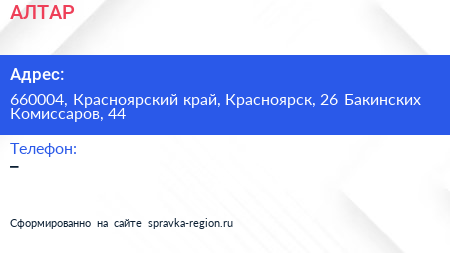 АЛТАР по адресу 660004, Красноярский край, Красноярск, 26 Бакинских Комиссаров, 44 в дальнейшем Организация, размещена в следующих категориях:
