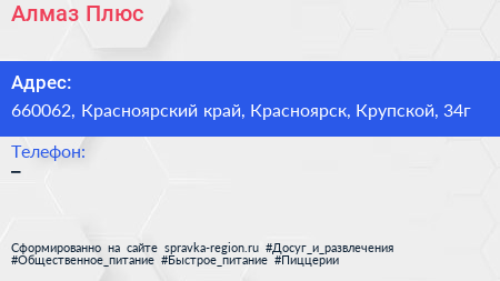 Алмаз Плюс по адресу 660062, Красноярский край, Красноярск, Крупской, 34г в дальнейшем Организация, размещена в следующих категориях: