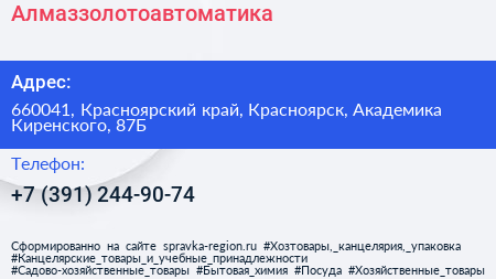 Алмаззолотоавтоматика по адресу 660041, Красноярский край, Красноярск, Академика Киренского, 87Б в дальнейшем Организация, размещена в следующих категориях: