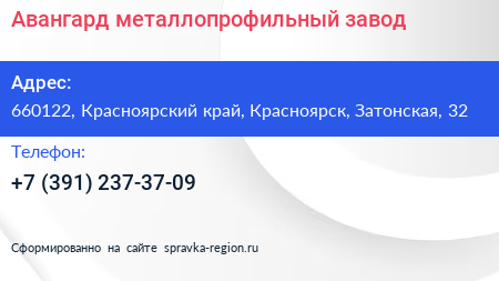 Авангард, металлопрофильный завод по адресу 660122, Красноярский край, Красноярск, Затонская, 32 в дальнейшем Организация, размещена в следующих категориях: