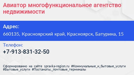 Авиатор, многофункциональное агентство недвижимости по адресу 660135, Красноярский край, Красноярск, Батурина, 15 в дальнейшем Организация, размещена в следующих категориях: