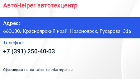 АвтоHelper, автотехцентр по адресу 660130, Красноярский край, Красноярск, Гусарова, 31а в дальнейшем Организация, размещена в следующих категориях: