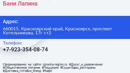 Бани Лапина по адресу 660015, Красноярский край, Красноярск, проспект Котельникова, 17г ст2 в дальнейшем Организация, размещена в следующих категориях: