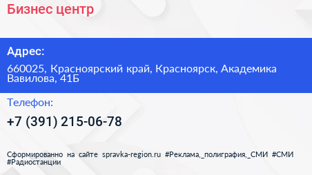 Бизнес-центр по адресу 660025, Красноярский край, Красноярск, Академика Вавилова, 41Б в дальнейшем Организация, размещена в следующих категориях: