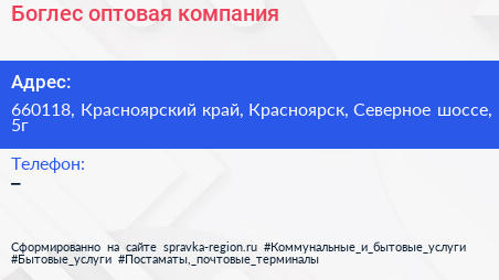 Боглес, оптовая компания по адресу 660118, Красноярский край, Красноярск, Северное шоссе, 5г в дальнейшем Организация, размещена в следующих категориях: