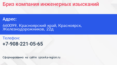 Бриз, компания инженерных изысканий по адресу 660099, Красноярский край, Красноярск, Железнодорожников, 22д в дальнейшем Организация, размещена в следующих категориях: