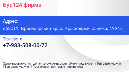 Бур124, фирма по адресу 663011, Красноярский край, Красноярск, Заимка, 199/5 в дальнейшем Организация, размещена в следующих категориях: