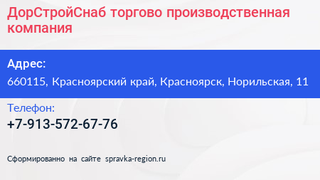 ДорСтройСнаб, торгово-производственная компания по адресу 660115, Красноярский край, Красноярск, Норильская, 11 в дальнейшем Организация, размещена в следующих категориях: