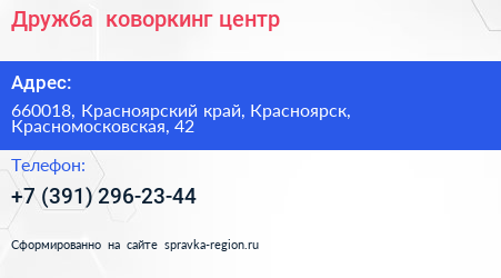 Дружба+, коворкинг-центр по адресу 660018, Красноярский край, Красноярск, Красномосковская, 42 в дальнейшем Организация, размещена в следующих категориях: