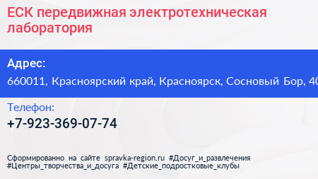 ЕСК, передвижная электротехническая лаборатория по адресу 660011, Красноярский край, Красноярск, Сосновый Бор, 40 в дальнейшем Организация, размещена в следующих категориях: