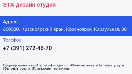 ЭТА, дизайн-студия по адресу 660020, Красноярский край, Красноярск, Караульная, 88 в дальнейшем Организация, размещена в следующих категориях: