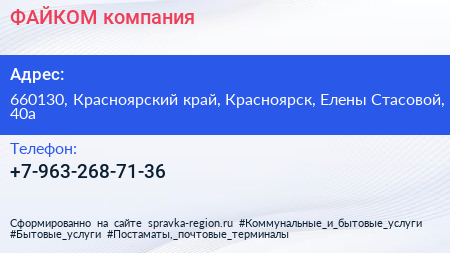 ФАЙКОМ, компания по адресу 660130, Красноярский край, Красноярск, Елены Стасовой, 40а в дальнейшем Организация, размещена в следующих категориях: