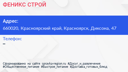 ФЕНИКС-СТРОЙ по адресу 660020, Красноярский край, Красноярск, Диксона, 47 в дальнейшем Организация, размещена в следующих категориях: