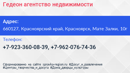 Гедеон, агентство недвижимости по адресу 660127, Красноярский край, Красноярск, Мате Залки, 10г в дальнейшем Организация, размещена в следующих категориях: