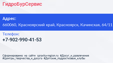 ГидроБурСервис по адресу 660060, Красноярский край, Красноярск, Качинская, 64/11 в дальнейшем Организация, размещена в следующих категориях: