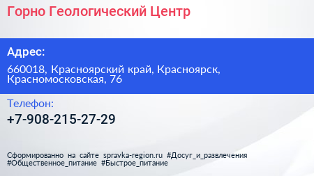 Горно-Геологический Центр по адресу 660018, Красноярский край, Красноярск, Красномосковская, 76 в дальнейшем Организация, размещена в следующих категориях: