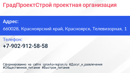 ГрадПроектСтрой, проектная организация по адресу 660028, Красноярский край, Красноярск, Телевизорная, 1 в дальнейшем Организация, размещена в следующих категориях: