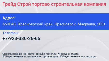 Грейд Строй, торгово-строительная компания по адресу 660048, Красноярский край, Красноярск, Маерчака, 103а в дальнейшем Организация, размещена в следующих категориях: