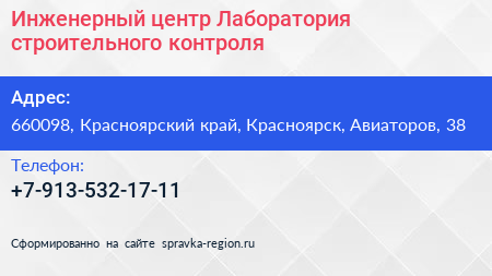 Инженерный центр Лаборатория строительного контроля по адресу 660098, Красноярский край, Красноярск, Авиаторов, 38 в дальнейшем Организация, размещена в следующих категориях: