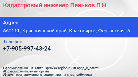 Кадастровый инженер Пеньков П.Н. по адресу 660111, Красноярский край, Красноярск, Ферганская, 6 в дальнейшем Организация, размещена в следующих категориях: