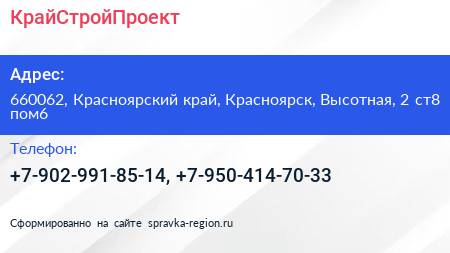 КрайСтройПроект по адресу 660062, Красноярский край, Красноярск, Высотная, 2 ст8 пом6 в дальнейшем Организация, размещена в следующих категориях: