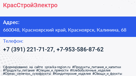 КрасСтройЭлектро по адресу 660048, Красноярский край, Красноярск, Калинина, 68 в дальнейшем Организация, размещена в следующих категориях: