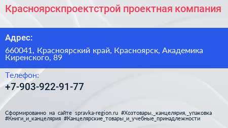 Красноярскпроектстрой, проектная компания по адресу 660041, Красноярский край, Красноярск, Академика Киренского, 89 в дальнейшем Организация, размещена в следующих категориях: