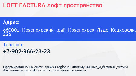 LOFT FACTURA, лофт-пространство по адресу 660001, Красноярский край, Красноярск, Ладо Кецховели, 22а в дальнейшем Организация, размещена в следующих категориях: