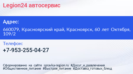 Legion24, автосервис по адресу 660079, Красноярский край, Красноярск, 60 лет Октября, 109/2 в дальнейшем Организация, размещена в следующих категориях: