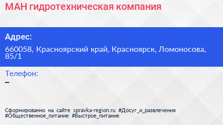 МАН, гидротехническая компания по адресу 660058, Красноярский край, Красноярск, Ломоносова, 85/1 в дальнейшем Организация, размещена в следующих категориях: