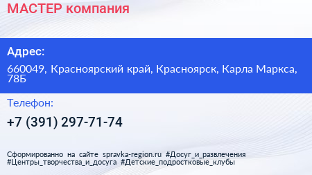 МАСТЕР, компания по адресу 660049, Красноярский край, Красноярск, Карла Маркса, 78Б в дальнейшем Организация, размещена в следующих категориях: