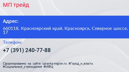 МП-трейд по адресу 660118, Красноярский край, Красноярск, Северное шоссе, 17 в дальнейшем Организация, размещена в следующих категориях: